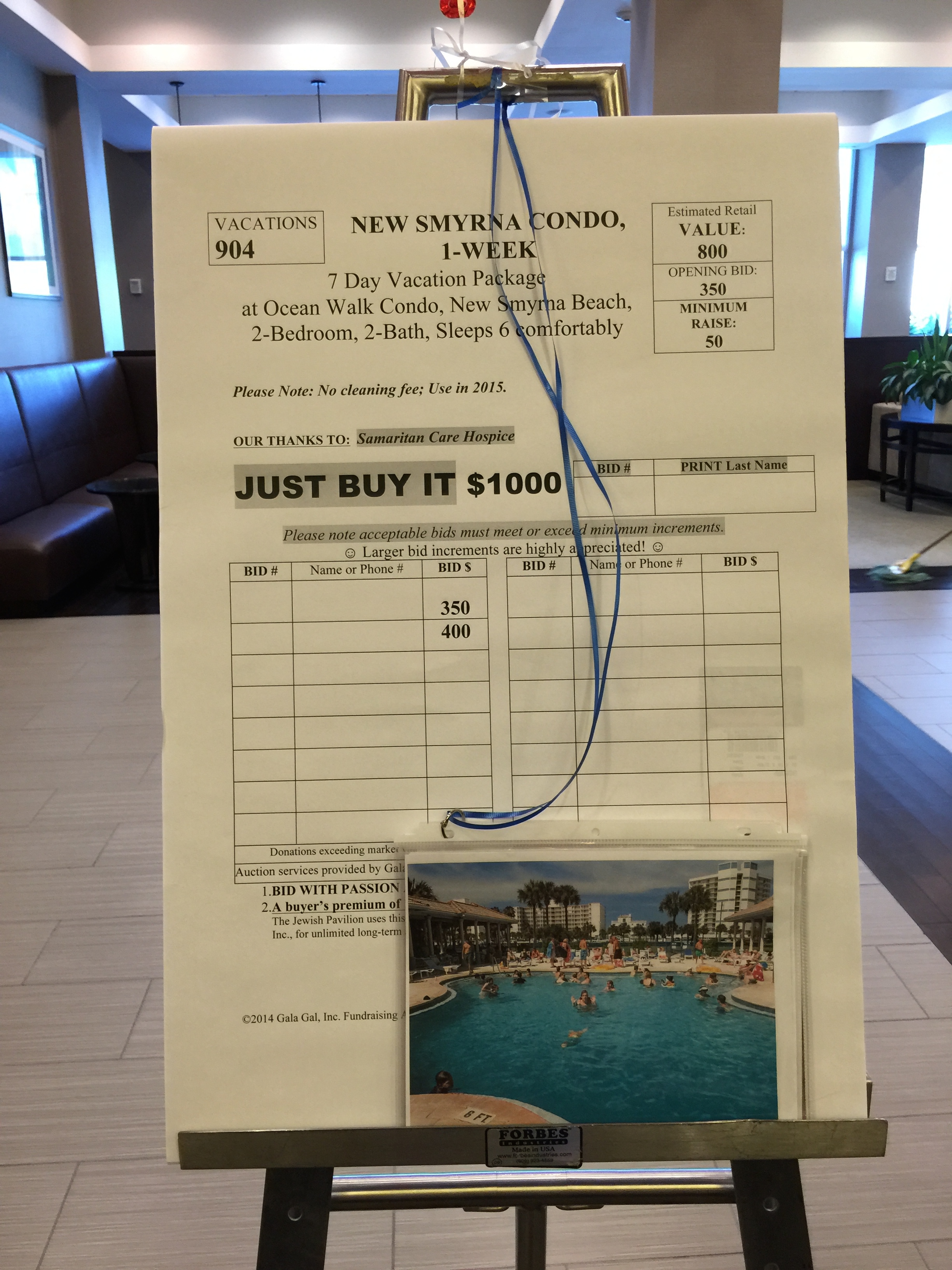 Since color displays of this size would be crazy expensive (like $20-40 each), we just printed the color photos, slid into clear slip sleeves from Office Depot, and attached via O-ring and ribbon. Guests still bid just like a normal bid sheet, though we did have Sharpies on hand to make bids easier to see.