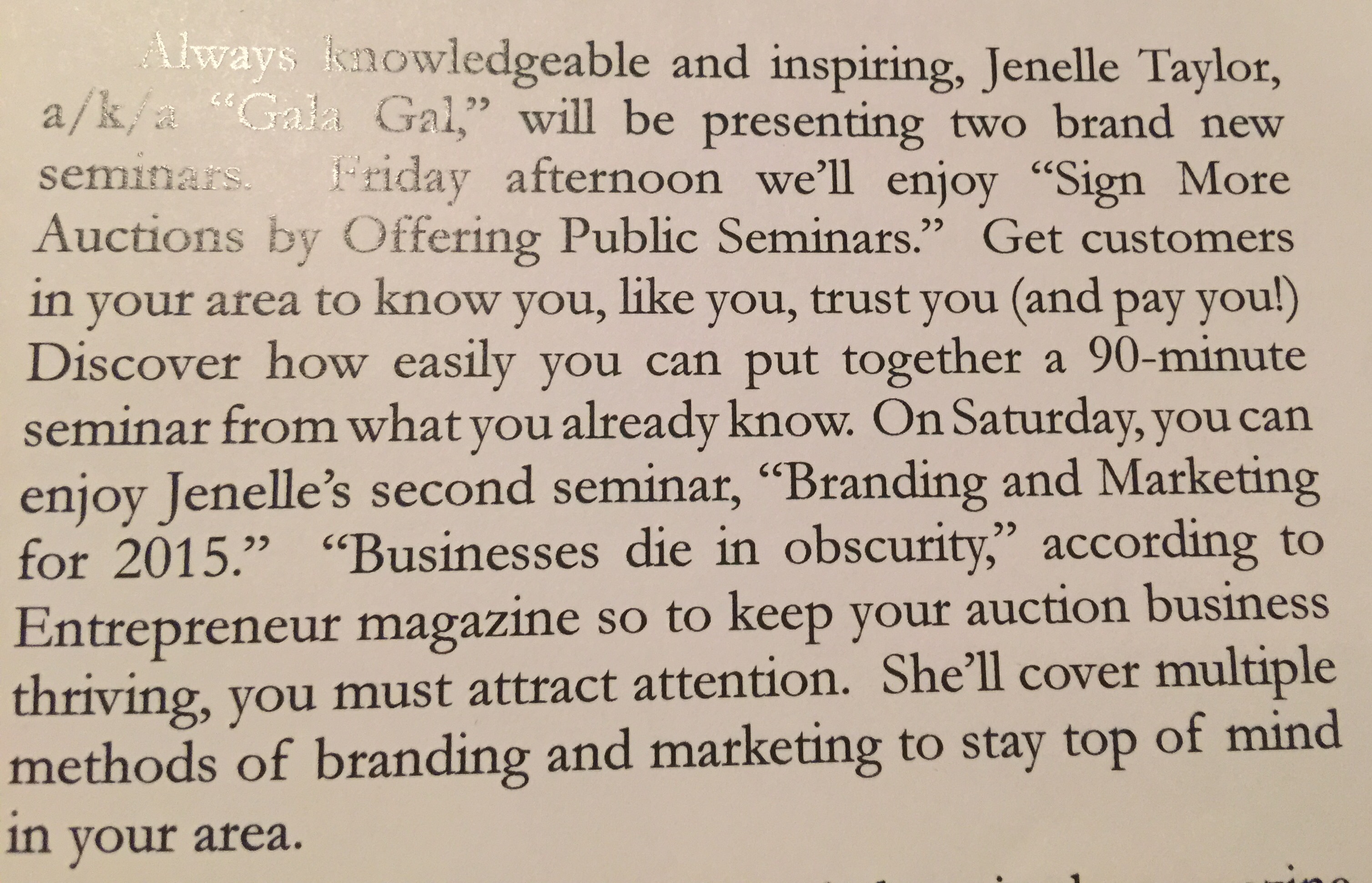 Since I’d also been one of their invited presenters in 2013, I’d already shared seminars with their members on Boosting Your Brand and 78 Ways to Better your Benefit Auction Business. This year I created 2 brand new seminars for the nearly 100 auctioneer attendees, coaching them on how to create valuable seminars for the public and how to tackle the avalanche of social media outlets in 2015.